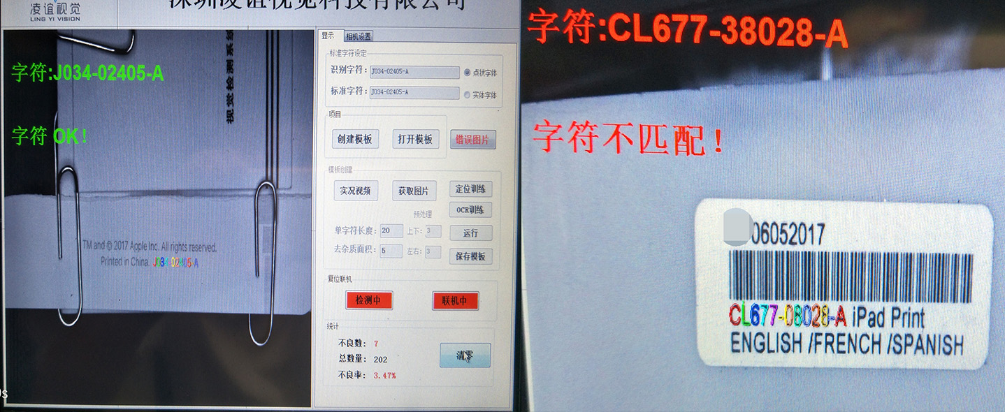 本字符識別系統常用于配合產品外包裝或產品說明書單頁上的字符識別防混,通過對料號字符的識別實現防止錯料混料的發生。系統可適用于手工線或自動線,具有識別速度快、準確率高的優點,有助于提高客戶良品率及生產效率。杜絕不良品流出導致的產品召回。